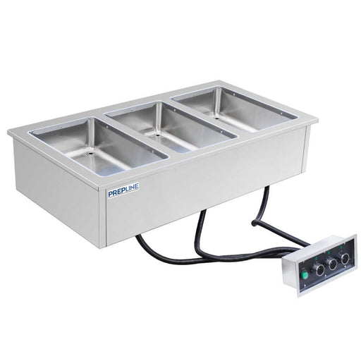PreplineStainless steel electric drop-in hot food well Accommodates three full size pans (12" x 20") or equivalent fractional pans Cut out size: 23-1/2" X...