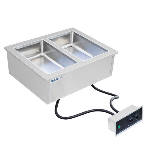PreplineStainless steel electric drop-in hot food well Accommodates two full size pans (12" x 20") or equivalent fractional pans Cut out size: 23-1/2" X 2...