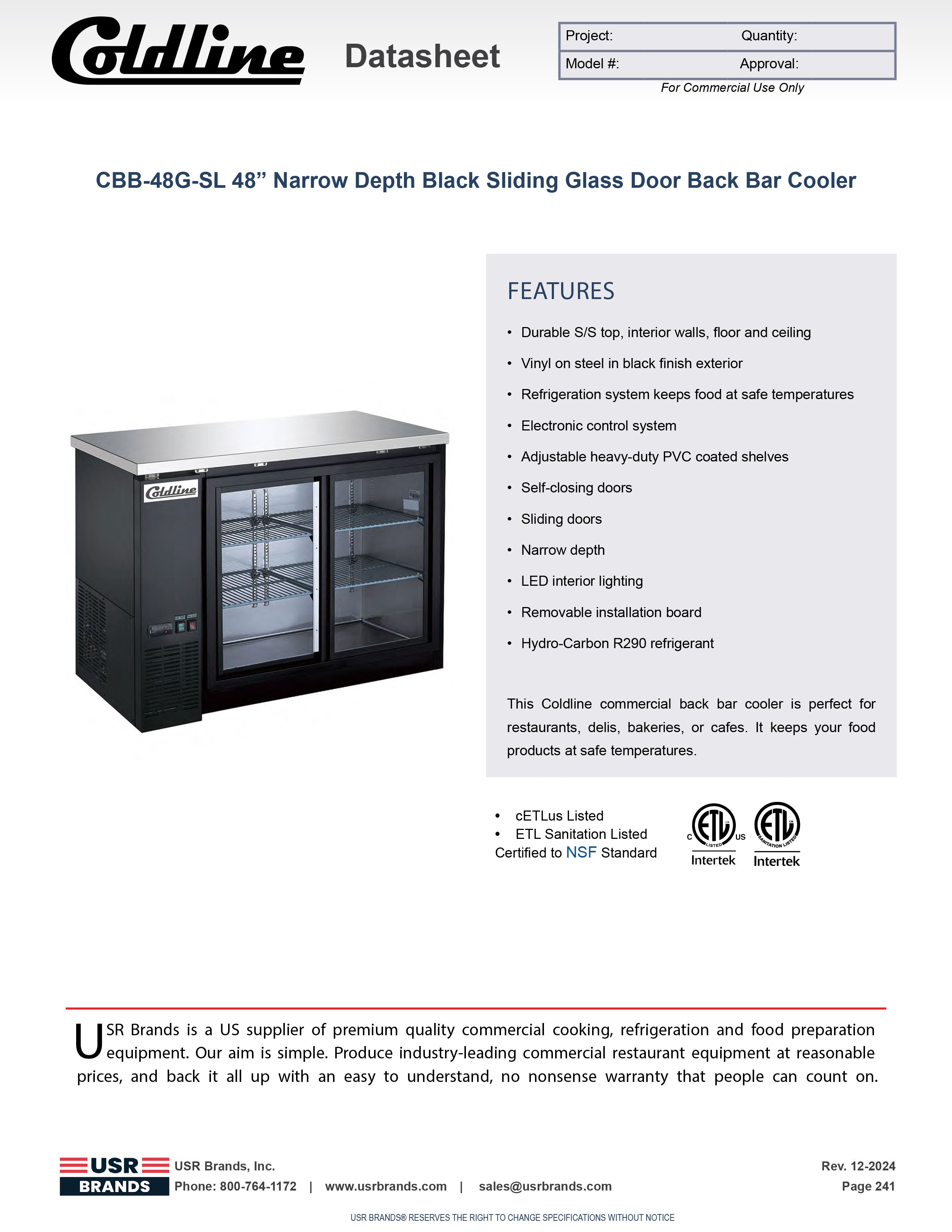Coldline CBB-48G-SL 48" Sliding Glass Door Back Bar Cooler, Black