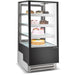 Display, cakes, baked goods, and pastries in this narrow black glass refrigerated bakery display case with 4 sides glass, top glass and LED lighting. 3 adjustable shelves and a base level provide plenty of room to show off all of your bakery foods. The LED lighting is standard along the top and under each shelf. Temperature is adjustable between 36.6 F to 47.4 F. The front and sides are all glass, even where it's black, bringing a modern design aesthetic to any bakery, cafe or shop looking to display refrigerated foods.